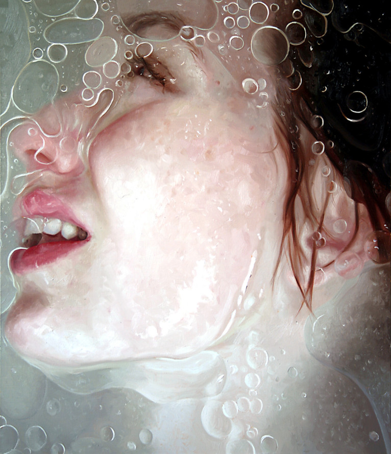 Alyssa Monks’ paintings explore the tension between abstraction and realism, using different filters to visually distort and disintegrate the body. In this shallow painted space, the subject is pushing against our real space. Strokes of thick paint in delicate color relationships are pushed and pulled to imitate glass, steam, water and flesh.