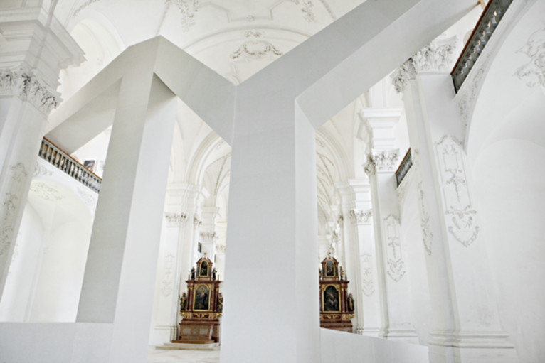 For the exhibition in the former monastery of Bellelay, Florian Graf turned the church into his own studio and apartment. In the entrance area, he built a 12 m high geometric sculpture which seemed to be supporting and at the same time destabilizing the Baroque architecture. The abstract monument within the monument appeared itself as an inhabitable structure. The choir was transformed into an apartment where furniture and found objects from daily life mingled with the artist’s sculptures and images.
