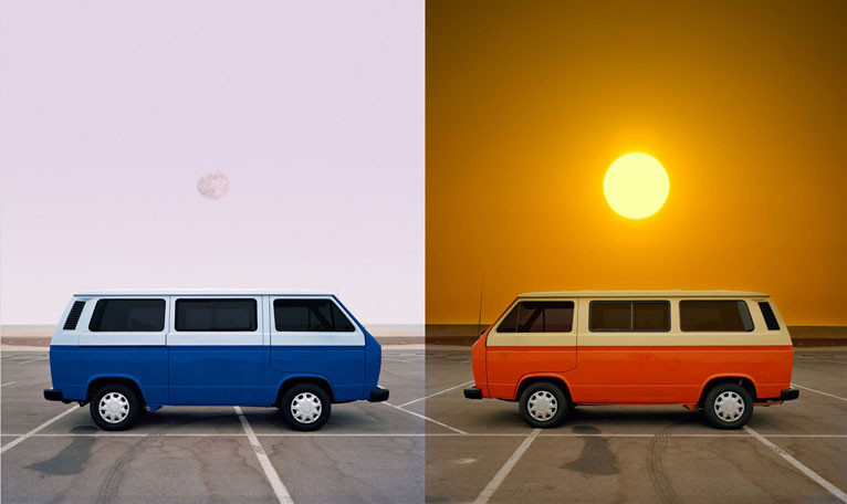 The photographic diptych of the Vanagon is presented as a Yin-Yang duality between sunrise and sunset, moonrise and moonset. The Vanagons face each other, as polar opposites (solar/lunar/dawn/dusk) but simultaneously equivalent and interchangeable. This duality is directly based upon the color scheme of two Volkswagen Vanagon models from 1982. One is a cool, two-tone blue/light-blue (representing dawn) with a full moon and daybreak-pink- purple sky above, and the other a warm, two-tone orange/cream (representing dusk) with a full sun and yellow-orange sunset sky above.