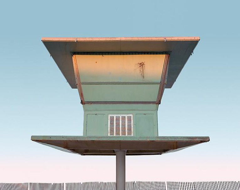With the new series, the artist’s intention is to create photographs that transform seemingly banal lifeguard towers that dot the Pacific beaches of Orange County into something other. They appear as awkward monumental public sculptures or stylized and non-functioning relics. The images of the lifeguard towers function less as a typology, but rather anthropomorphized as a group of portraits, not only because they resemble heads resting on necks, but also because the individual character of each tower is emphasized in a very specific way.
