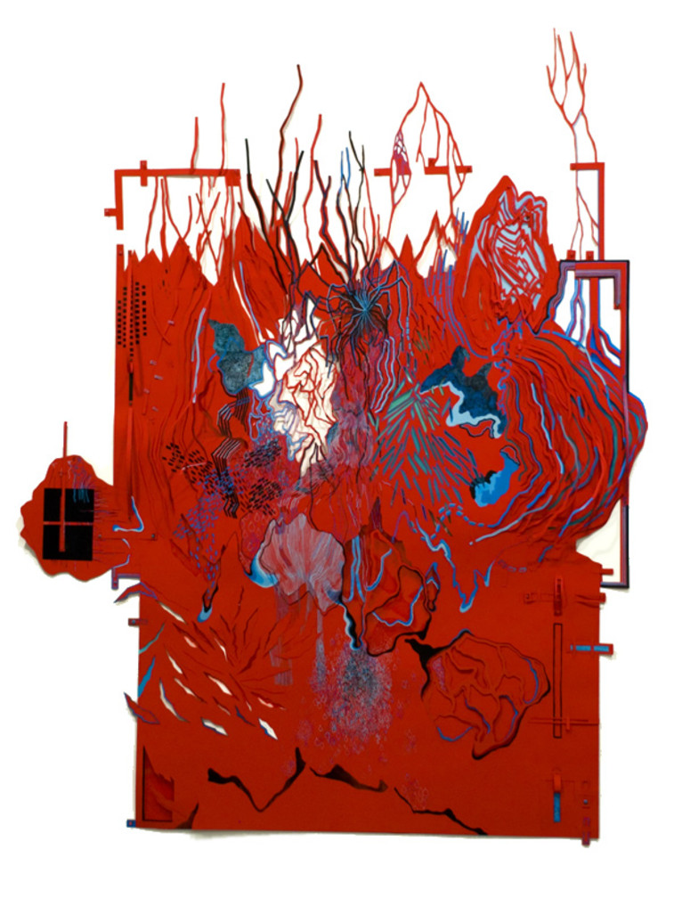 Punctuated Equilibrium, 2000, ink, acrylic, felt tip markers, pipe cleaners, paper on canvas, 56×57.5×2 inches
