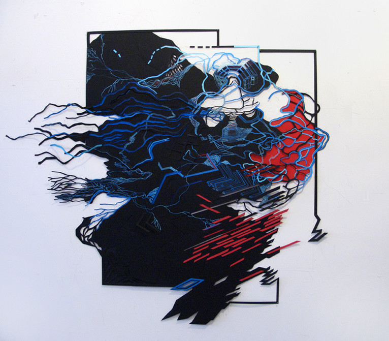 Ratite, 2008, paper, vynil, map pins, acrylic, ink, and velour paper, 43x47x1 inches