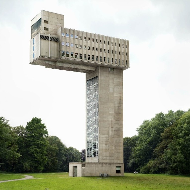 Some of Dujardin’s resampled buildings are structurally impossible, constructed in ways that defy engineering. More often they are subtly implausible; for instance, they may be window- or doorless, or juxtapose materials in unlikely combinations or at improbable scales. Some of the most intriguing buildings seem perfectly ordinary at first glance, revealing their fictional nature as the viewer registers missing or incongruous details, such as a staircase several stories up on a modern apartment block, with no guardrail.
