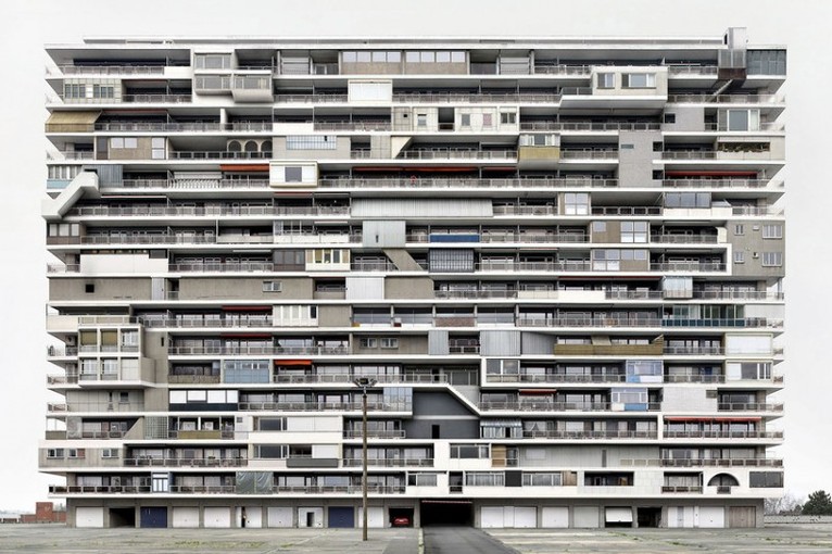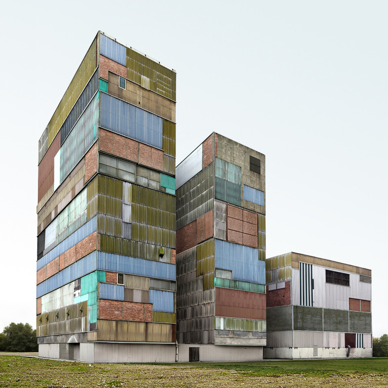 In addition to his more traditional work, Belgian photographer Filip Dujardin creates imaginary buildings by resampling pictures of real buildings; that is, he digitally pieces together elements of existing architecture to create fictional structures. Dujardin often starts with a specific idea for an image, then creates a cardboard maquette or a 3D computer model of the final shape he has in mind. Staying near his home in Ghent, he searches out buildings to photograph that will supply the desired textures and edges. Back at the computer in his studio he cuts, pastes, and shapes segments from these building images and compiles them into the form that he envisioned.