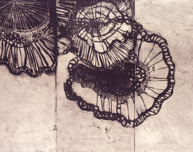 Beautiful giant etchings by Ritsuko Ozeki. Ozeki utilizes many print processes in her editioned work, while focusing primarily on sugar lift and line etching to create intricate, painterly surfaces.