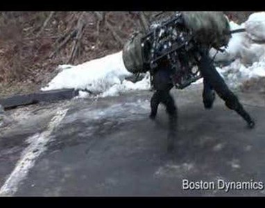 BigDog is the alpha male of the Boston Dynamics robots. It is a rough-terrain robot that walks, runs, climbs and carries heavy loads. BigDog is powered by an engine that drives a hydraulic actuation system. Absolutely mesmerizing to watch this robot make its way around human territory.