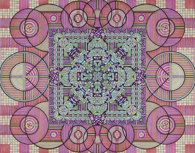 For fifty years Eugene Andolsek had a secret life creating drawings with vibrant colors and linear complexity in his free time. Working at his kitchen table on graph paper with compass and straight edge he laid out black lines and geometries filling in spaces with colored inks mixed with eye droppers to achieve dazzling compositions. read more
