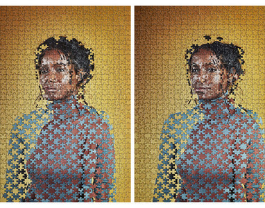 Alma Hazer photographed sets of identical twins and made them into identical jigsaw puzzles. She then swaps every other piece of their puzzles, completely mixing them half and half. Not always knowing where their eyes, mouth and lips would end up read more