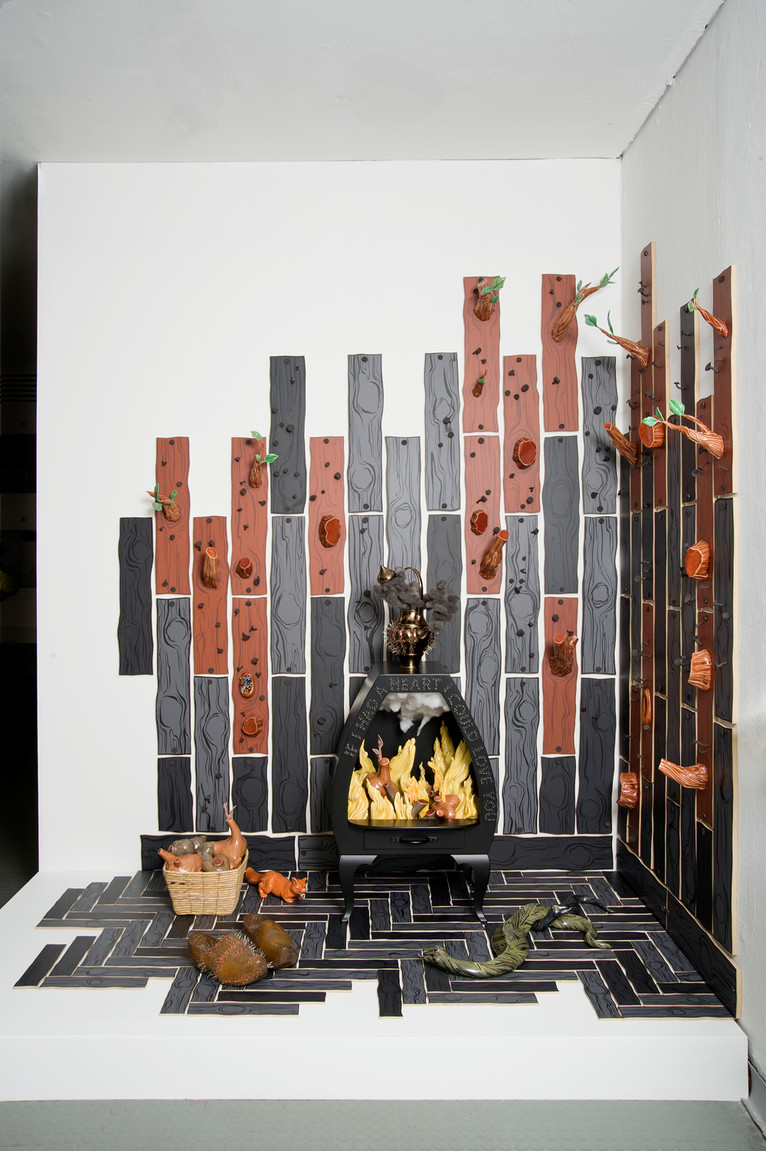 In the hut there is a fireplace, the burning logs look like hearts, but the hearts look like real hearts and the branches sticking out of them resembles blood filled arteries and veins. The hut is in a forest or maybe the hut is the forest; the wooden planks are sprouting and coming to life, or maybe they were alive and someone is cutting them down? This uncanny and dark fairytale is fragmented, like in a crime story the clues are scattered around, the viewer is the detective trying to make sense of it all. The installation was made for the RCA SHOW 2011.