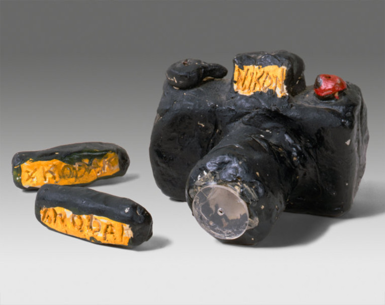 A clay replica of a Nikon SLR camera that Sachs made when he was eight years old as a gift to his father. This contrasts with his recent elegy to the now-defunct Polaroid Corporation: a fully functional “instant” camera that has been cobbled together out of (among other things) a Canon digital camera, a tiny HP inkjet printer, and a battery from a Makita cordless drill.