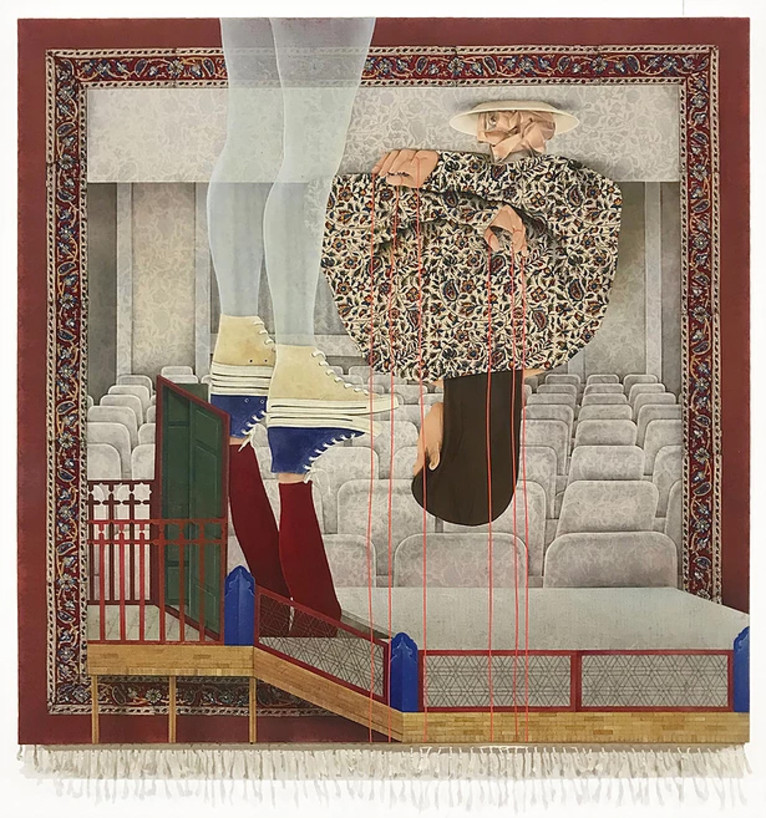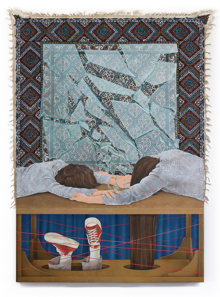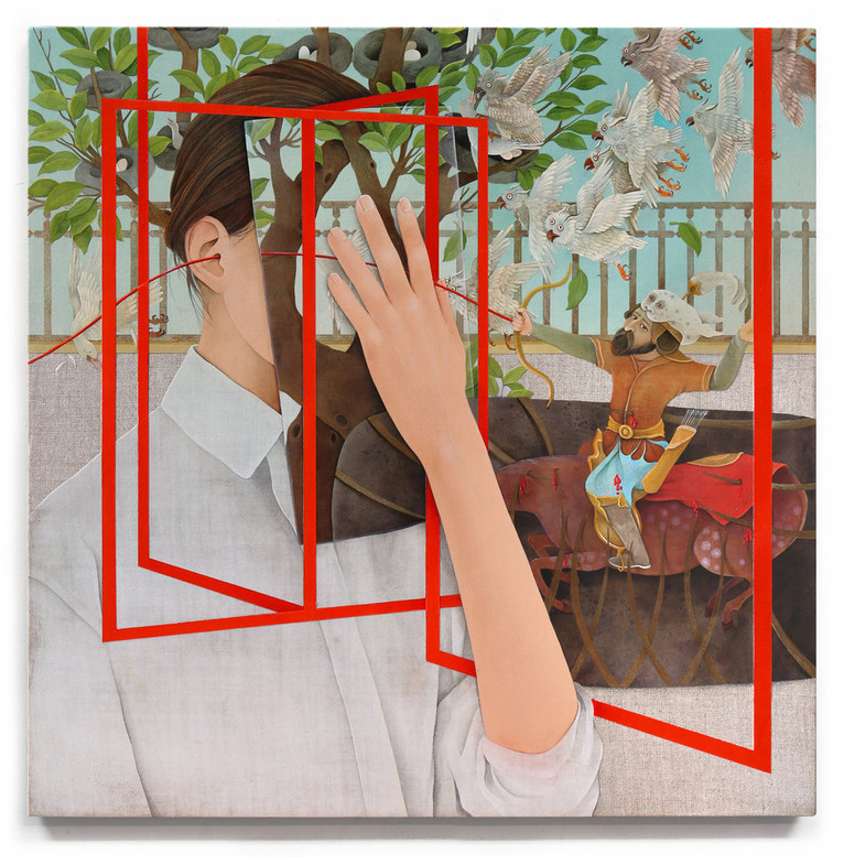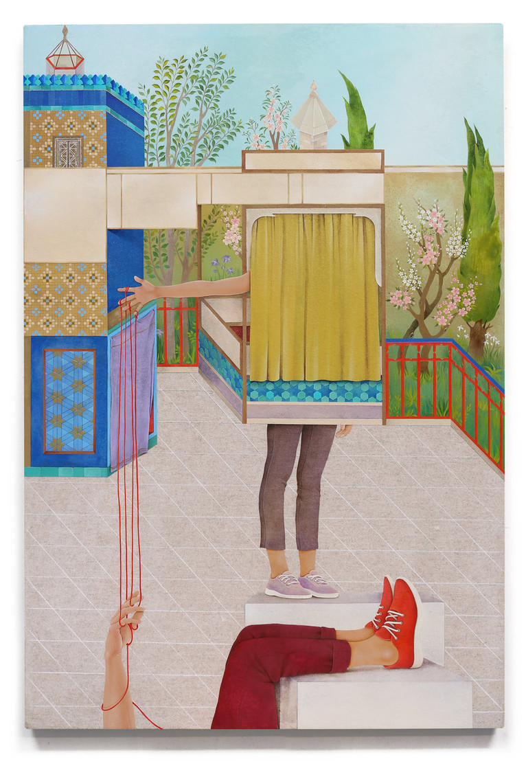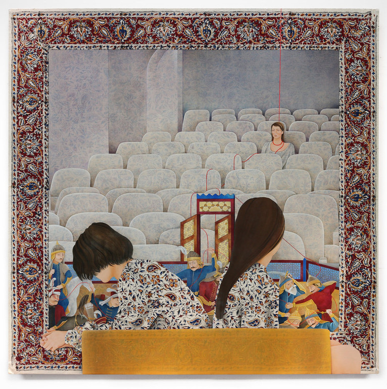 Painter Arghavan Khosravi was raised in Tehran, Iran. Khosravi’s work is deeply connected to her own personal experience of the culture and politics of her homeland of Iran that probe both personal and political experiences by integrating historical motifs with imagery taken from popular culture and contemporary media.