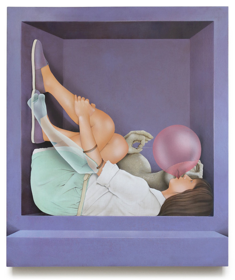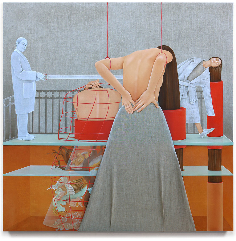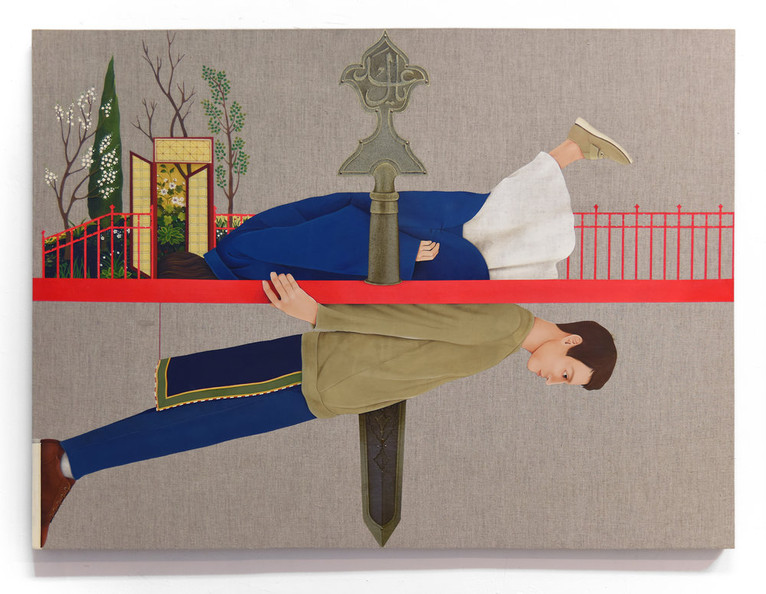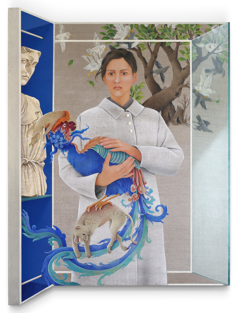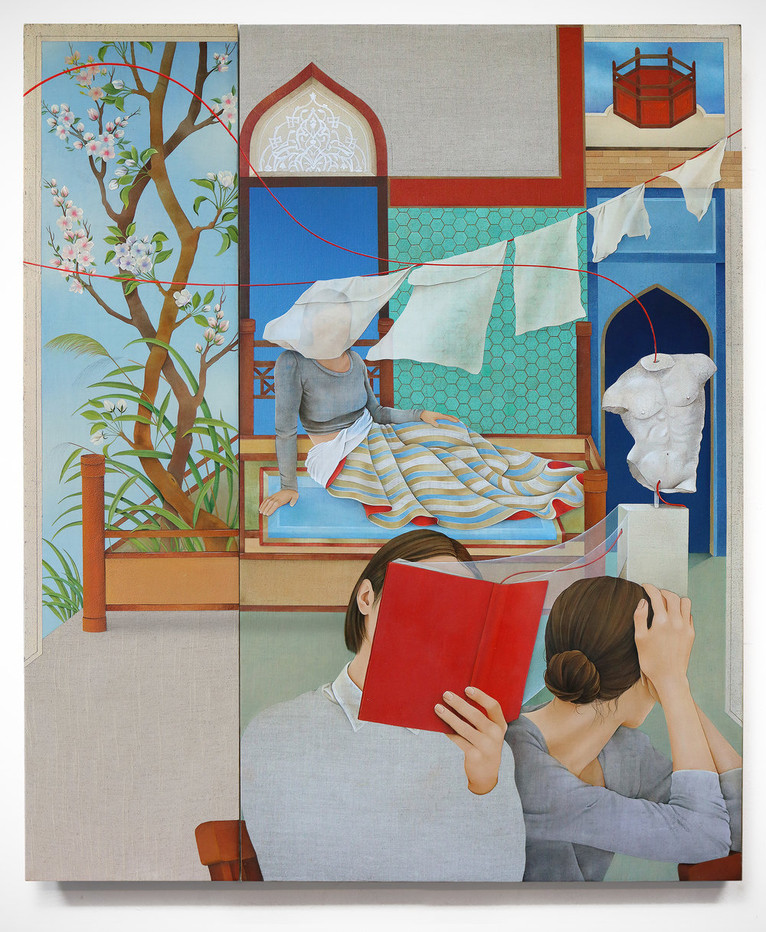 Painter Arghavan Khosravi was raised in Tehran, Iran. Khosravi’s work is deeply connected to her own personal experience of the culture and politics of her homeland of Iran that probe both personal and political experiences by integrating historical motifs with imagery taken from popular culture and contemporary media.