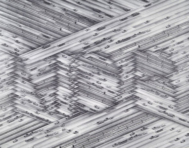 German artist Thomas Bayrle was born 1937 in Berlin and now lives and works in Frankfurt. As a founding figure in Germany’s Pop movement along with Sigmar Polke and Gerhard Richter, Thomas Bayrle has been influential as both an artist and as a teacher at Frankfurt’s Staedelschule for over thirty years. Shown here is NDR from 1976, heliography on paper, 95.2 x 78.4 cm.