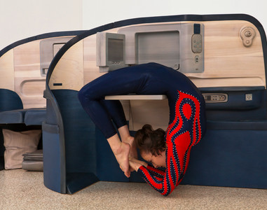 In Body in Flight (Delta) and Body in Flight (American), Allora & Calzadilla appropriated the forms of state-of-the art elite business class seats and reproduced full-scale wooden replicas stained like polychromatic religious icons. In Body in Flight (Delta) the artists substitute the airline seat replica for a balance beam to be used by a female gymnast from USA Gymnastics—the national governing body for gymnastics in the U.S. read more