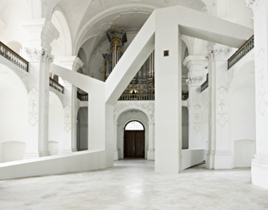 For the exhibition in the former monastery of Bellelay, Florian Graf turned the church into his own studio and apartment. In the entrance area, he built a 12 m high geometric sculpture which seemed to be supporting and at the same time destabilizing the Baroque architecture. The abstract monument within the monument appeared itself as an inhabitable structure. read more