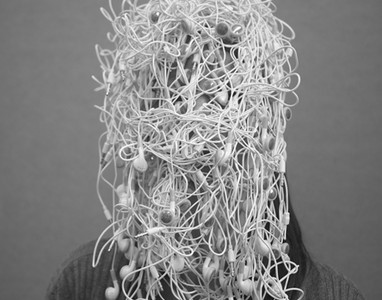 Clay sculpture featuring human hands and cotton thread by Israeli artist, Ronit Baranga.