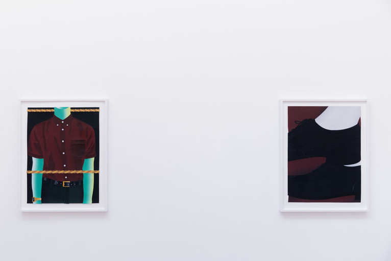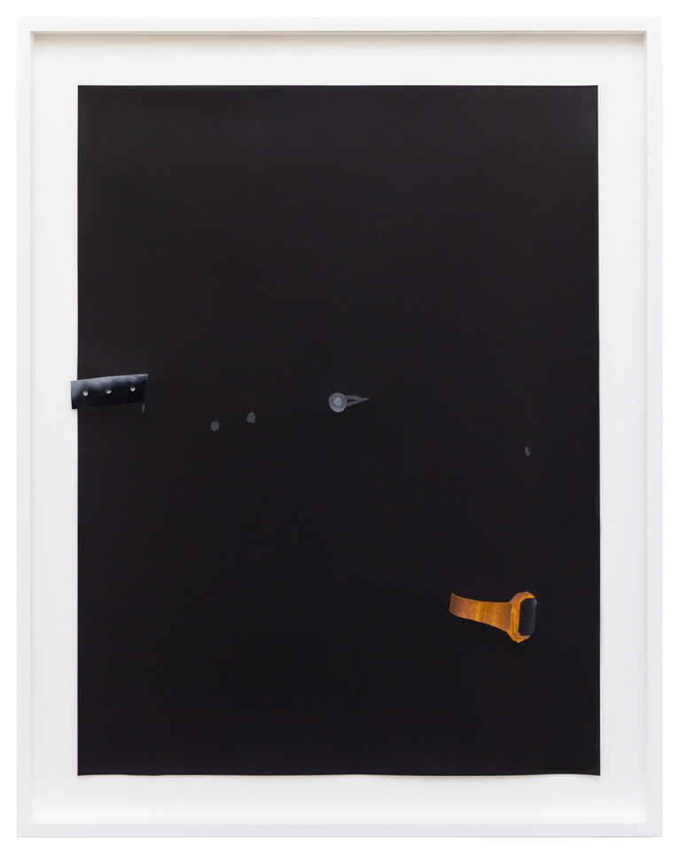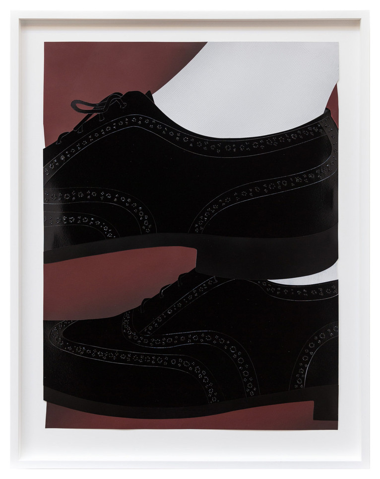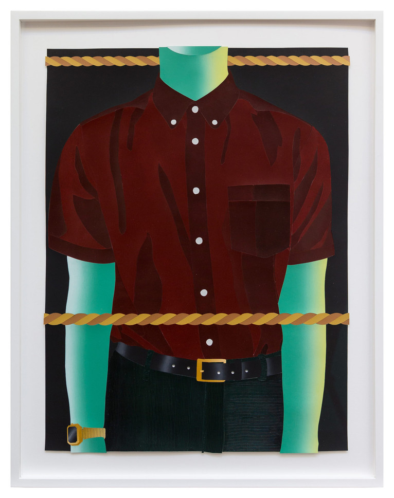 There is a paradox between the mundane and the highly erotic in these collages. Iacono has perfected the opposing forces of titillation and boredom that might occur in one’s thought processes at the prospect of a sexual encounter. Comprising a few ostensibly unremarkable props alongside a figure, at first glance the viewer may not notice anything out of the ordinary in his mise-en-scènes. But look again; ambiguity and lust lurk between the lines. Shoes, jeans, button-down shirts, belts and rope – the remnants from the act of disrobing and some light BDSM play – come into view. Outlines and shadows of faceless, nameless, anonymous figures emerge, almost always in a standing position in the midst of some quietly perverse act. Never a participant, but always watching from a distance as a witness to some sort of sexual activity, Iacono makes the audience complicit in his scopophilic surveillance of encounters between queer bodies.