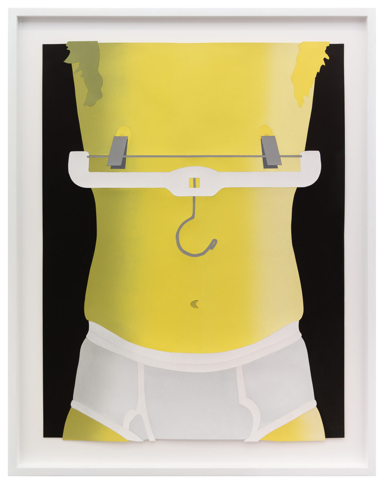 Anthony Iacono builds his distinctive collages by meticulously assembling hand-painted and cut fragments of paper. Seemingly masquerading as paintings due to their bold palette and slick, flattened surface, these collages merge the figurative with still-life to evoke strange night-time scenes. Bodies appear alongside quotidian objects such as fruit, plants, curtains, hangers, and shrimp cocktails. Iacono reconfigures the raison d’être of these banal and everyday items, replacing their original functions with physical pleasure and perversion.