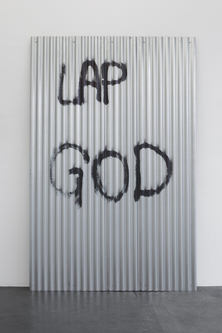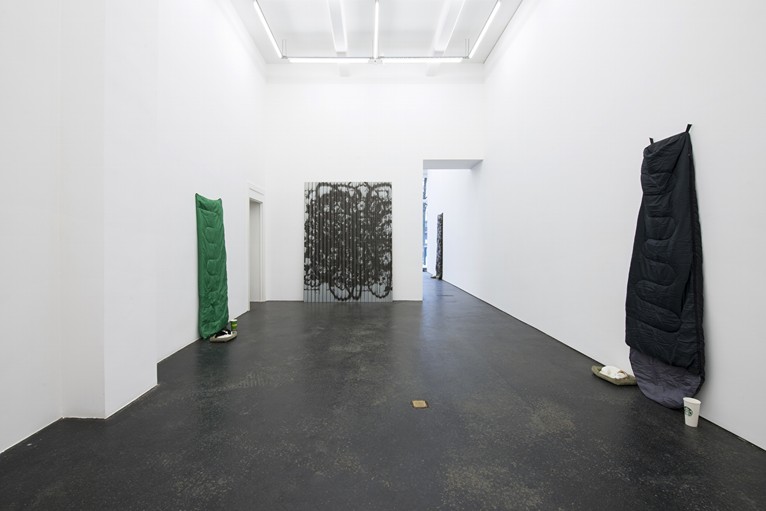 Colour co-ordinated and purchased readymade online, Keith Farquhar’s Lap Gods schematise present day conditions of social disenfranchisement, dispassionately rendering it as a visual equation. They reflect the obscenity of contemporary welfare practices at the same time as reflexively addressing issues of artistic agency and the institutional structures in which artworks currently circulate as objects. These pieces share a founding logic with earlier works by Farquhar that repurposed clothing commonly associated with subcultural groups, such as the ‘hoodies’ vilified by right-wing British media. Likewise, they display an affinity with a more recent body of work on corrugated steel panelling, several of which were exhibited as part of Farquhar’s first solo exhibition with the gallery in 2015. In these works low resolution images appropriated from a range of sources, including the spray-painted gestures of Christopher Wool, are conflated in such a way as to problematise the boundaries between hierarchical categories such as the ‘web,’ the ‘gallery’ and the ‘street.’