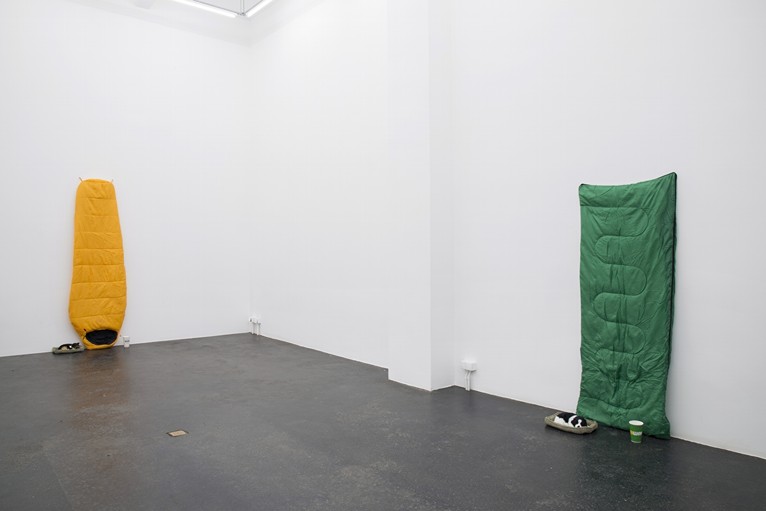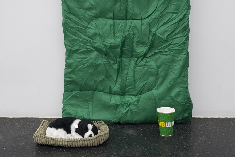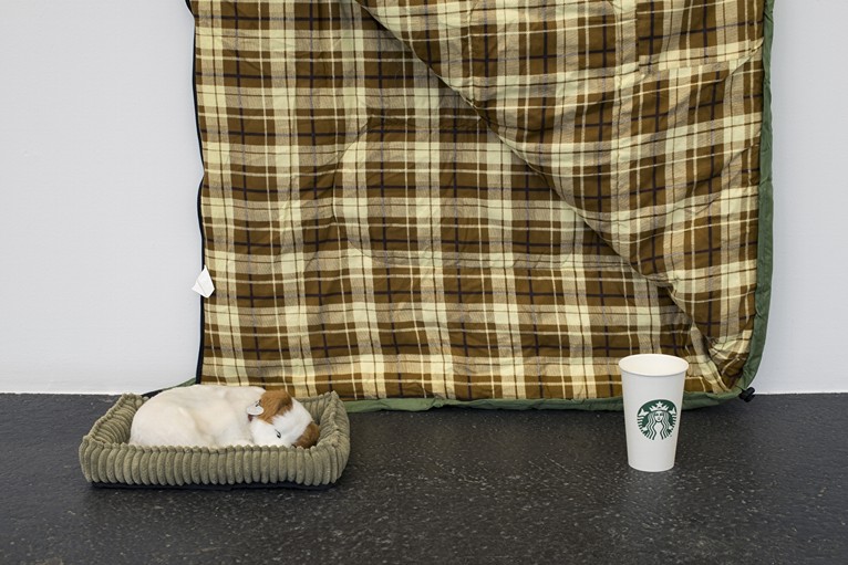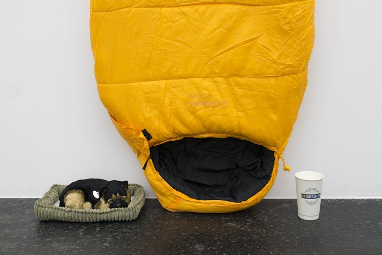 The artist’s own term for the restricted vocabulary of elements adopted in his Lap Gods series is that of an ‘economy.’ In these circumstances the meaning of his phrasing is twofold, in that what is formally economical about these works –a tripartite arrangement of sleeping bag, coffee cup and mechanically breathing toy dog– can obviously also be interpreted in relation to a range of global economic factors. Here, brands such as Greggs, Café Nero and Starbucks act as stand-ins for the cultural dynamic of a UK high street, post Brexit. The plush lap-dogs are arguably a specific nod to Farquhar’s native Edinburgh: an urban environment where the mechanics of social exclusion act in tandem with a highly sentimentalised, heritage-oriented worldview.