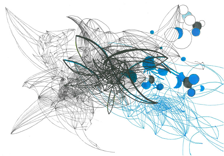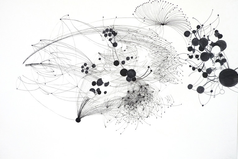 Maess explores the topic of emergence as motifs to describe the idea of cyber-intuitive space. Using multilayered interactive structures as patterns, Maess creates drawings that explores raw data sets derived from sources such as professional network connections, airline destinations, demographics, Facebook mentions, and others. Through algorithmic manipulation, the data generates intricate patterns of inter-connectivity that translates into lines and nodes of varying thickness and color.